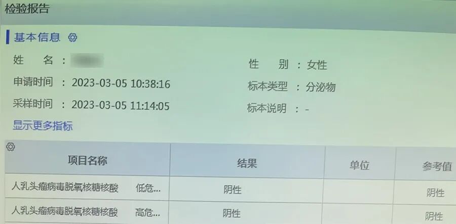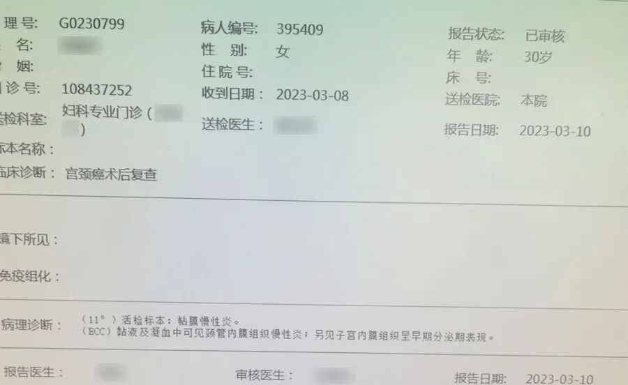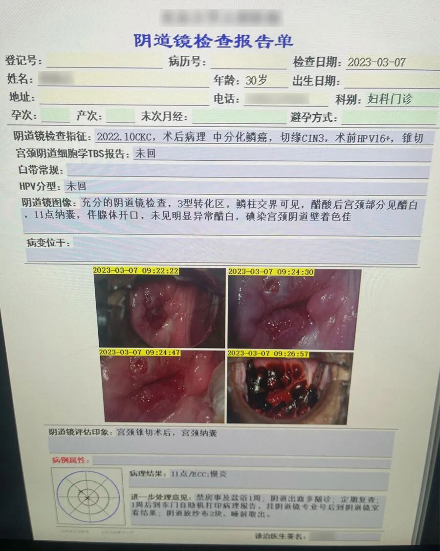· 2023年3月7日(用药后五个月)阴道镜报告显示:11点/ECC:慢炎;