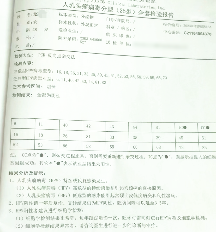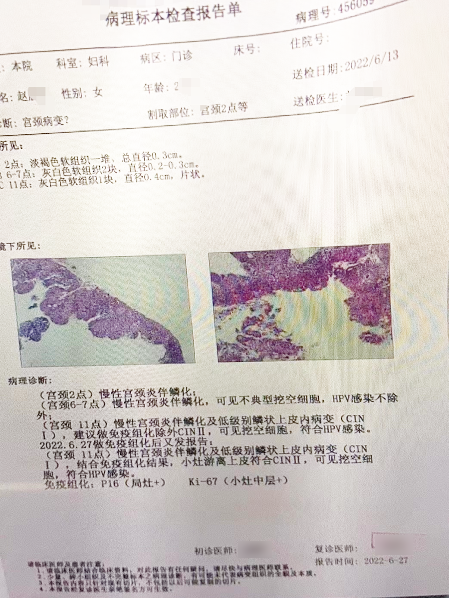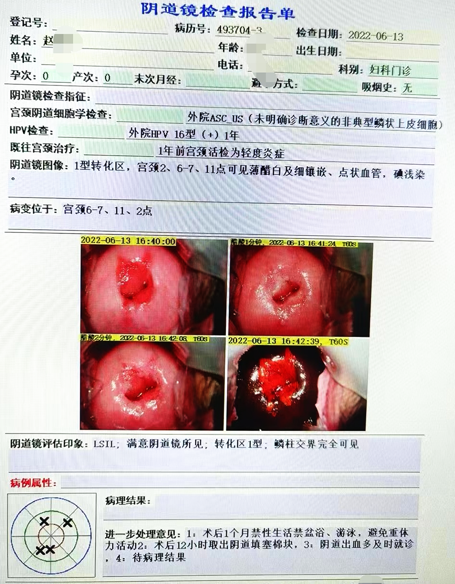 病例简介 赵XX,27岁,已婚未孕; 主诉 · 患者因接触性出血,阴道分泌物多并且痒到医院就诊; 既往史 · 患者因单纯性人乳头瘤病毒感染曾经使用过干扰素治疗无效; 现病史 · 2022年6月13日阴道镜报告显示:LSIL; 转化区I型;鳞柱交界完全可见; 病理报告显示: (宫颈2点)慢性宫颈炎伴鳞化; (宫颈6-7点)慢性宫颈炎伴鳞化,可见不典型挖空细胞,HPV感染不除外; (宫颈11点)慢性宫颈炎伴鳞化及低级别鳞状上皮内病变(CIN I),建议做免疫组化除外CIN II,可见挖空细胞,符合HPV感染; 2022.6.27做免疫组化后又发报告: (宫颈11点)慢性宫颈炎伴鳞化及低级别鳞状上皮内病变(CIN I),结合免疫组化结果,小灶游离上皮符合CIN II,可见挖空细化,符合HPV感染; 患者特点 治疗方案及措施 · 患者于2022年10月15日经充分知情同意后开始使用红卡(外用红色诺卡氏菌细胞壁骨架)每次2支隔日一次,治疗10次后,修复期复查转阴。嘱其保持好的生活习惯; · 指导健康生活方式,适当运动,保持良好心态; 治疗转归 · 2023年3月18日(用药后五个月)复查: HPV显示:HPV 16(-);