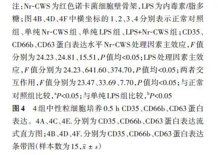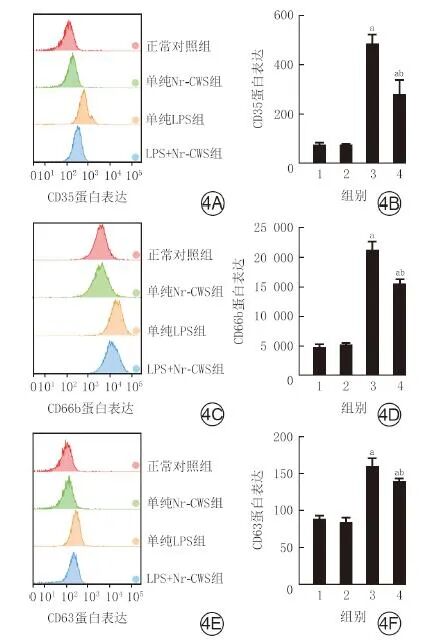 培养0.5 h,与正常对照组比较,单纯Nr-CWS组细胞CD35、CD66b、CD63蛋白表达均无明显变化(t值分别为0.34、1.24、0.85,P<0.05),单纯LPS组与LPS+Nr-CWS组细胞CD35、CD66b、CD63蛋白表达均显著升高(t值分别为16.75、17.45、10.82,5.70、19.35、15.37,P<0.05)。与单纯LPS组比较,LPS+Nr-CWS组细胞CD35、CD66b、CD63蛋白表达均明显下降(t值分别为4.92、5.72、3.18,P<0.05)。见图4。