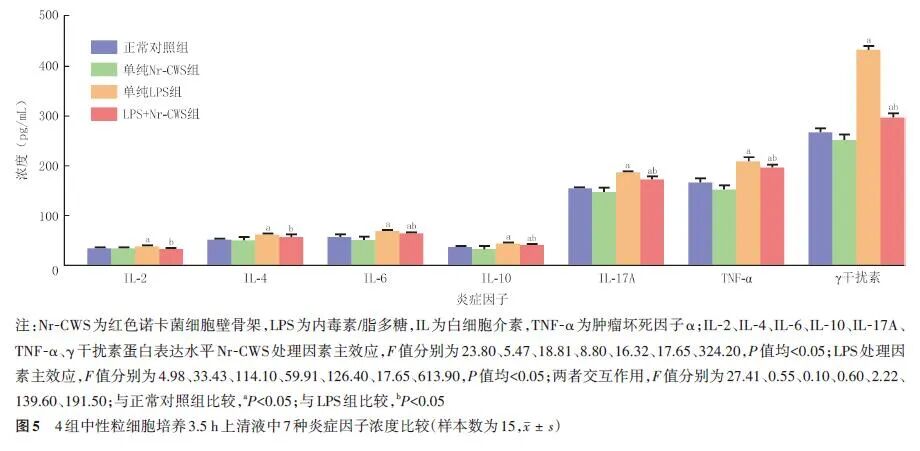 培养3.5 h,与正常对照组比较,单纯Nr-CWS组细胞培养上清液中IL-2、IL-4、IL-6、IL-10、IL-17A、TNF-α、γ干扰素浓度均无明显变化(t值分别为1.59、0.95、2.46、1.82、1.45、2.49、2.27,P>0.05);单纯LPS组细胞培养上清液中上述7种炎症因子浓度均显著升高(t值分别为22.10、9.50、7.21、10.22、24.88、8.43、47.48,P<0.05);LPS+Nr-CWS组细胞培养上清液中IL-6、IL-10、IL-17A、TNF-α、γ干扰素浓度均显著上升(t值分别为4.68、5.12、8.02、5.58、7.13,P<0.05),IL-2、IL-4浓度均无明显变化(t值分别为1.23、1.60,P>0.05)。与单纯LPS组比较,LPS+Nr-CWS组细胞培养上清液中上述7种炎症因子浓度均显著降低(t值分别为5.39、2.83、5.79、2.90、5.88、4.88、39.64,P<0.05)。见图5。