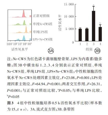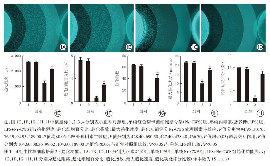方法 采用实验研究方法。2022年5月―10月招募于苏州市体检中心体检的成年健康志愿者15名(男7名、女8名,年龄24~45岁),采集外周静脉血,采用免疫磁珠分选法提取中性粒细胞。将细胞分为不进行任何处理的正常对照组、仅用终质量浓度为60 ng/mL Nr-CWS处理的单纯Nr-CWS组、仅用终质量浓度1 μg/mL内毒素/脂多糖(LPS)刺激的单纯LPS组、用同前LPS刺激后用Nr-CWS处理的LPS+Nr-CWS组。培养2 h,采用改良后的琼脂糖下细胞趋化模型检测中性粒细胞的趋化距离、趋化细胞百分比、趋化指数、最大趋化速度、趋化功能评分。采用流式细胞术检测培养0.5 h发生吞噬的细胞占比与荧光强度,活性氧水平,颗粒蛋白CD35、CD66b、CD63的蛋白表达水平及培养3.5 h细胞培养上清液中炎症因子白细胞介素2(IL-2)、IL-4、IL-6、IL-10、IL-17A、肿瘤坏死因子α(TNF-α)、γ干扰素浓度。以上实验各组样本数均为15。对数据行析因设计方差分析与独立样本t检验。