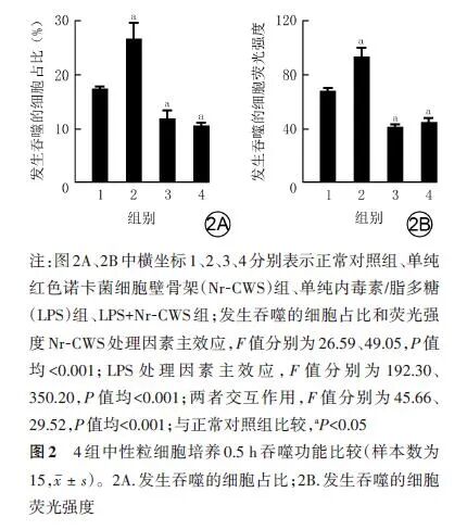 培养0.5 h,与正常对照组比较,单纯Nr-CWS组发生吞噬的细胞占比和荧光强度均显著升高(t值分别为6.86、6.73,P值均为0.001),单纯LPS组与LPS+Nr-CWS组发生吞噬的细胞占比(t值分别为7.35、22.72,P值均<0.001)和荧光强度(t值分别为21.37、13.10,P值均<0.001)均显著降低。与单纯LPS组比较,LPS+Nr-CWS组发生吞噬的细胞占比和荧光强度均无明显变化(t值分别为1.61、2.05,P值分别为0.158、0.087)。见图2。